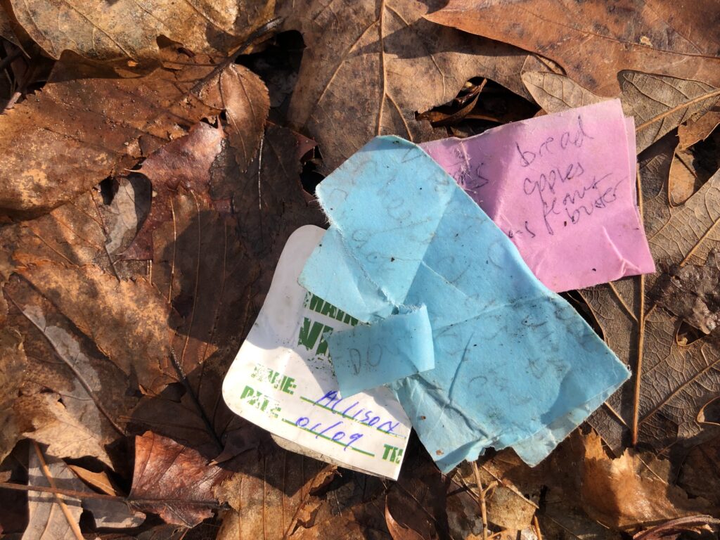 I live in a small town on a dirt road right next to 250 acres of woods about 15 miles north of NYC. I walk my dogs in those woods several times a week. Often during the week, I walk with a good friend and neighbor who has 2 dogs just like me. Several days ago we were walking on a trail and I looked down and saw a few small pieces of paper laying in a pile of leaves. I remember thinking “Wow; that’s a bummer– it looks like those may have fallen out of someone’s pocket”. Just at that moment, we encountered another person with their dog. All the dogs began to excitedly play and that distracted me from my task of picking up the trash.
